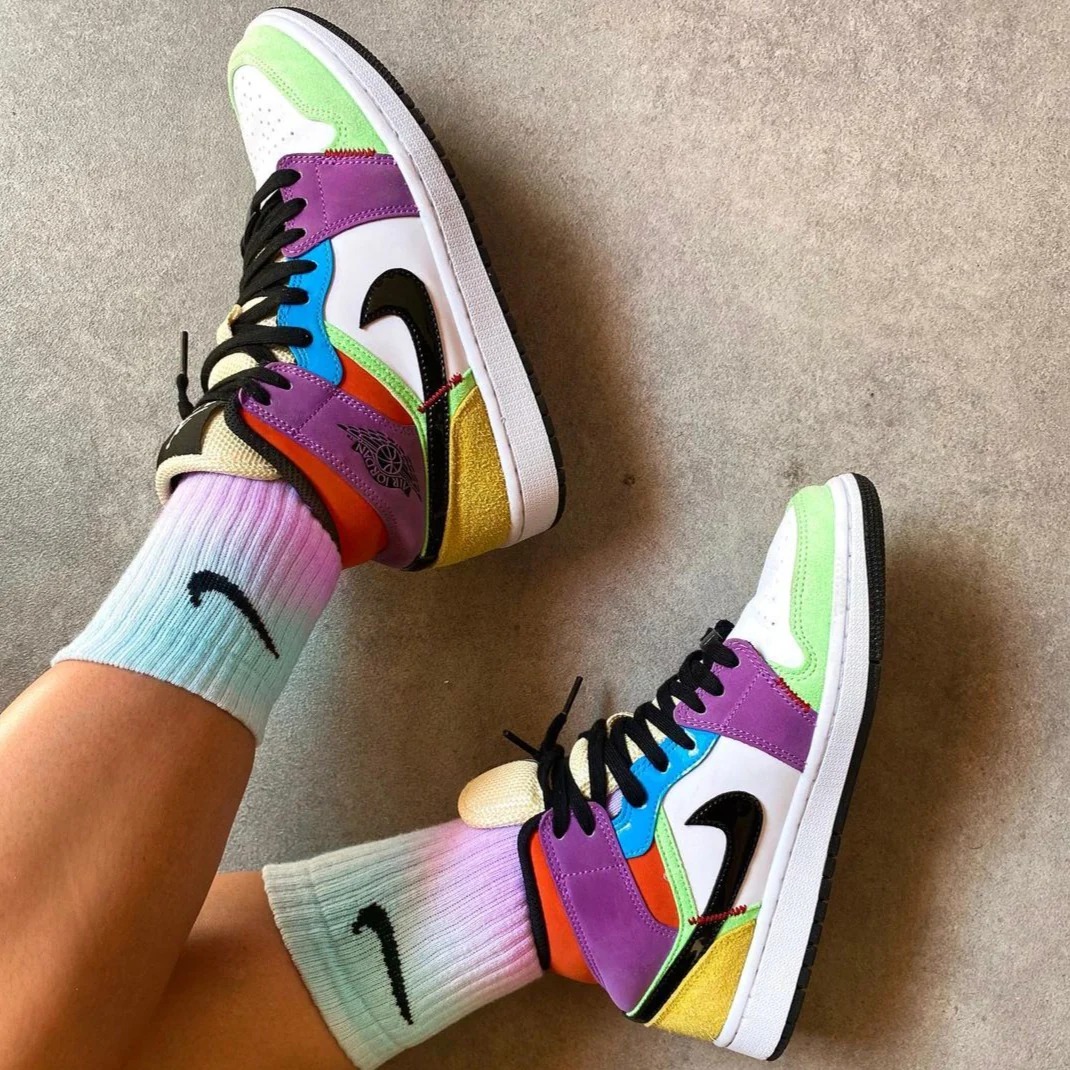Description: A collection of colours takes over the upper of this multicoloured Jordan 1 for a bright and bold appearance. White leather covers the upper providing a supportive and sturdy base, overlayed with soft suede panels in a variety of different colours for a bold finish. Pastel green suede works around the toe cap sitting below the white toe box with perforation holes scattered for a breathable fit. Flashes of yellow brighten up the heel, wrapping around the back of the shoe and sitting below the orange collar. Black Swooshes standout stretched across the medial and lateral sidewalls of this AJ1 green white purple. Added flashes of colour include pops of purple at the bottom of the lace unit and around the collar.