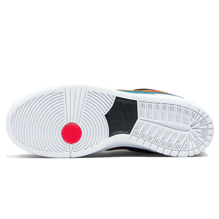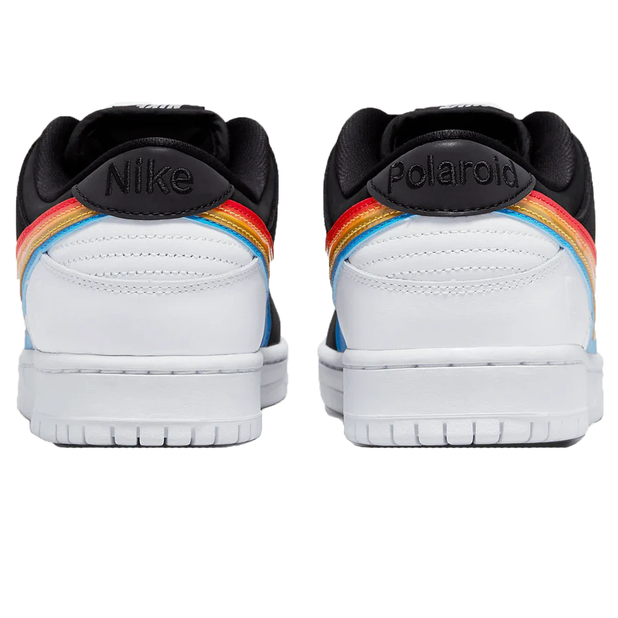 Description: Smooth black suede dresses up most of the upper of this shoe from the base to the overlays to create the perfect canvas for the rainbow-coloured profile stacked Swooshes on both the medial and lateral sides. The top Swoosh is in red and the bottom Swoosh is in blue with a translucent middle Swoosh in yellow to produce the secondary colours of orange and green. Where the Swooshes end at the heel, a white panel takes over, matching the midsoles. A rainbow bar sits on the toe box region. Nike branding in white embellishes the black mesh tongue and the heel tabs show off embroidered black-on-black branding of Nike on the left shoe and Polaroid on the right shoe. Colourful insoles with mismatched co-branding on both left and right shoes are a nice finishing touch.