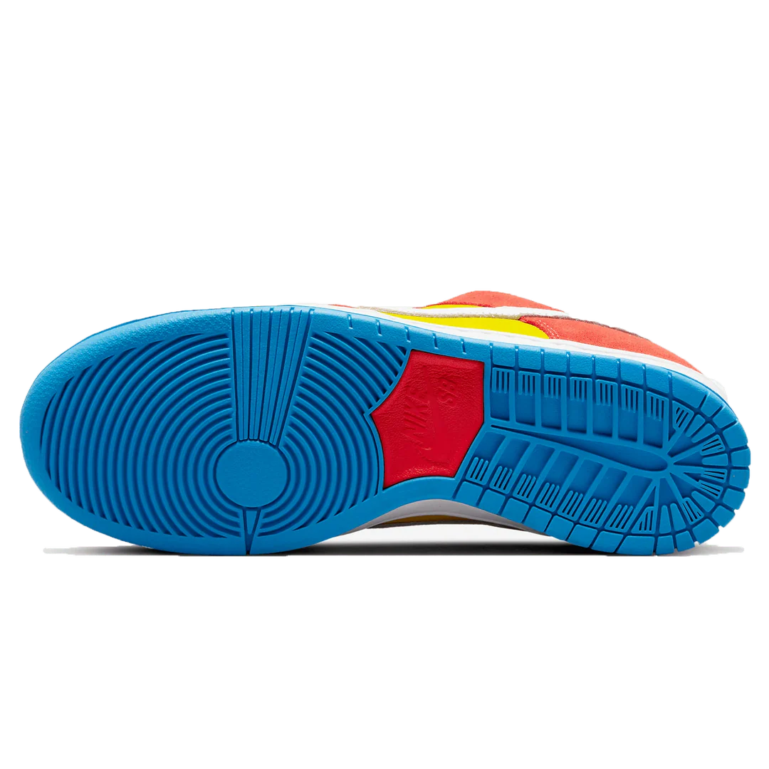Description: This colourful pair matches the iconic “The Simpsons” character’s signature look. This SB Dunk Low’s tumbled yellow leather base represents Bart himself, while the red suede overlays and laces are a likely homage to his t-shirt. Elsewhere, the hits of blue in the chunky foam-padded tongue, inner lining and outsole could be a call-back to Bart’s shorts and shoes. Rounding off the quirky design are the subtle white accents in the Swoosh, midsole, and brandings at the tongue and heel tab.